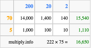 Finally, we add up all the sums we found in step 3 to get our final answer to 222 times 75.