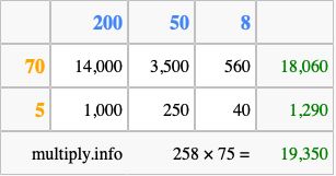 Below is an illustration showing you how to calculate 258 times 75 using the box method, using the instructions above.