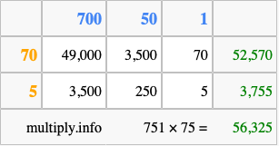 That's all there is to it! As you can see from the box above, the answer to 751 times 75 using the box method is 56,325.