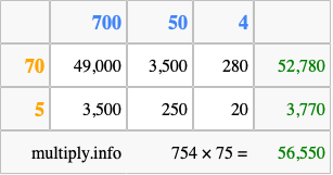 That's all there is to it! As you can see from the box above, the answer to 754 times 75 using the box method is 56,550.