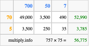 That's all there is to it! As you can see from the box above, the answer to 757 times 75 using the box method is 56,775.