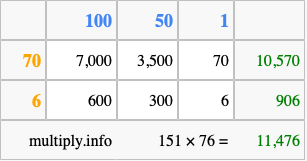 Below is an illustration showing you how to calculate 151 times 76 using the box method, using the instructions above.