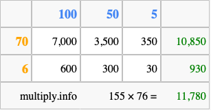 Finally, we add up all the sums we found in step 3 to get our final answer to 155 times 76.