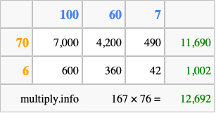 Below is an illustration showing you how to calculate 167 times 76 using the box method, using the instructions above.