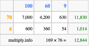 Below is an illustration showing you how to calculate 169 times 76 using the box method, using the instructions above.