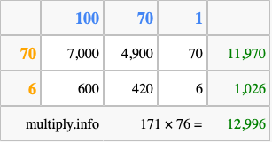 Below is an illustration showing you how to calculate 171 times 76 using the box method, using the instructions above.