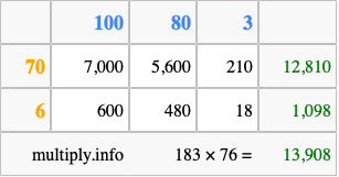That's all there is to it! As you can see from the box above, the answer to 183 times 76 using the box method is 13,908.