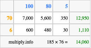 Finally, we add up all the sums we found in step 3 to get our final answer to 185 times 76.