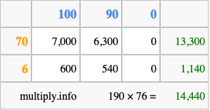 Below is an illustration showing you how to calculate 190 times 76 using the box method, using the instructions above.