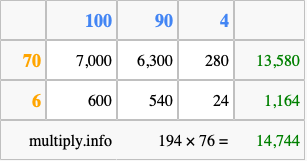 That's all there is to it! As you can see from the box above, the answer to 194 times 76 using the box method is 14,744.