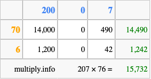 Finally, we add up all the sums we found in step 3 to get our final answer to 207 times 76.