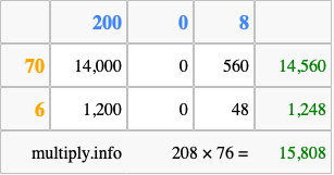 Finally, we add up all the sums we found in step 3 to get our final answer to 208 times 76.
