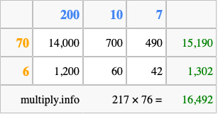 That's all there is to it! As you can see from the box above, the answer to 217 times 76 using the box method is 16,492.