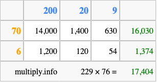 That's all there is to it! As you can see from the box above, the answer to 229 times 76 using the box method is 17,404.