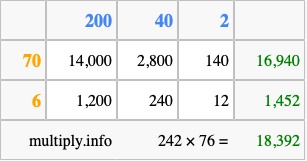 That's all there is to it! As you can see from the box above, the answer to 242 times 76 using the box method is 18,392.