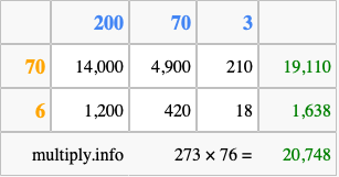 That's all there is to it! As you can see from the box above, the answer to 273 times 76 using the box method is 20,748.