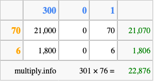 That's all there is to it! As you can see from the box above, the answer to 301 times 76 using the box method is 22,876.
