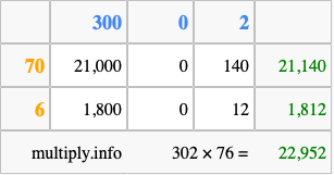 Finally, we add up all the sums we found in step 3 to get our final answer to 302 times 76.