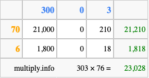 That's all there is to it! As you can see from the box above, the answer to 303 times 76 using the box method is 23,028.
