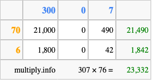 Finally, we add up all the sums we found in step 3 to get our final answer to 307 times 76.