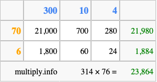 Finally, we add up all the sums we found in step 3 to get our final answer to 314 times 76.
