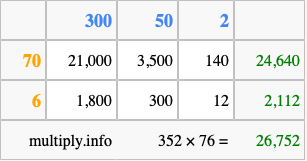 Finally, we add up all the sums we found in step 3 to get our final answer to 352 times 76.
