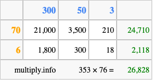 Below is an illustration showing you how to calculate 353 times 76 using the box method, using the instructions above.