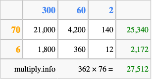 Finally, we add up all the sums we found in step 3 to get our final answer to 362 times 76.
