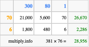 That's all there is to it! As you can see from the box above, the answer to 381 times 76 using the box method is 28,956.