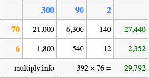 That's all there is to it! As you can see from the box above, the answer to 392 times 76 using the box method is 29,792.
