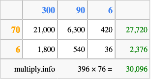 Finally, we add up all the sums we found in step 3 to get our final answer to 396 times 76.