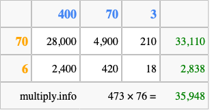 That's all there is to it! As you can see from the box above, the answer to 473 times 76 using the box method is 35,948.