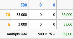 That's all there is to it! As you can see from the box above, the answer to 500 times 76 using the box method is 38,000.