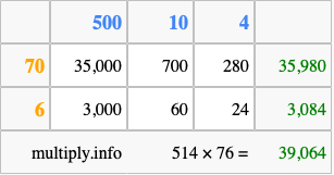 Below is an illustration showing you how to calculate 514 times 76 using the box method, using the instructions above.