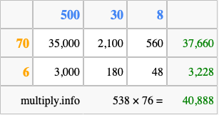That's all there is to it! As you can see from the box above, the answer to 538 times 76 using the box method is 40,888.