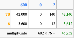 That's all there is to it! As you can see from the box above, the answer to 602 times 76 using the box method is 45,752.