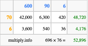 That's all there is to it! As you can see from the box above, the answer to 696 times 76 using the box method is 52,896.