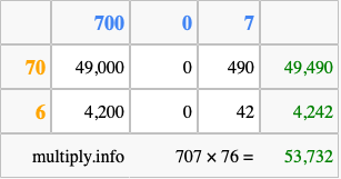 That's all there is to it! As you can see from the box above, the answer to 707 times 76 using the box method is 53,732.
