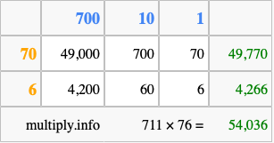 That's all there is to it! As you can see from the box above, the answer to 711 times 76 using the box method is 54,036.