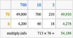 Below is an illustration showing you how to calculate 713 times 76 using the box method, using the instructions above.