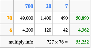 That's all there is to it! As you can see from the box above, the answer to 727 times 76 using the box method is 55,252.