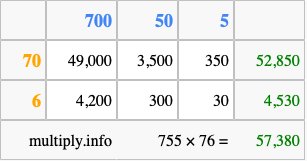 Finally, we add up all the sums we found in step 3 to get our final answer to 755 times 76.