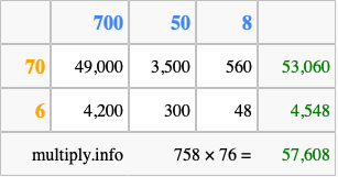That's all there is to it! As you can see from the box above, the answer to 758 times 76 using the box method is 57,608.