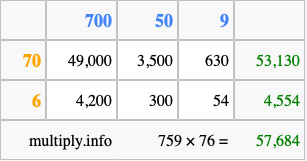 Finally, we add up all the sums we found in step 3 to get our final answer to 759 times 76.
