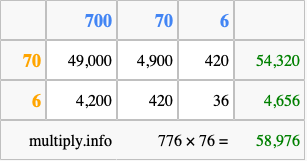 Finally, we add up all the sums we found in step 3 to get our final answer to 776 times 76.