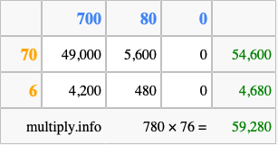 Finally, we add up all the sums we found in step 3 to get our final answer to 780 times 76.