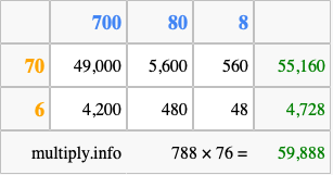 Finally, we add up all the sums we found in step 3 to get our final answer to 788 times 76.