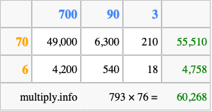 That's all there is to it! As you can see from the box above, the answer to 793 times 76 using the box method is 60,268.