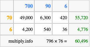 Finally, we add up all the sums we found in step 3 to get our final answer to 796 times 76.