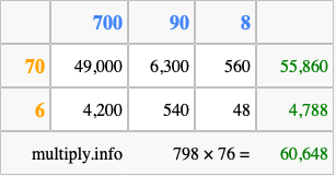 That's all there is to it! As you can see from the box above, the answer to 798 times 76 using the box method is 60,648.